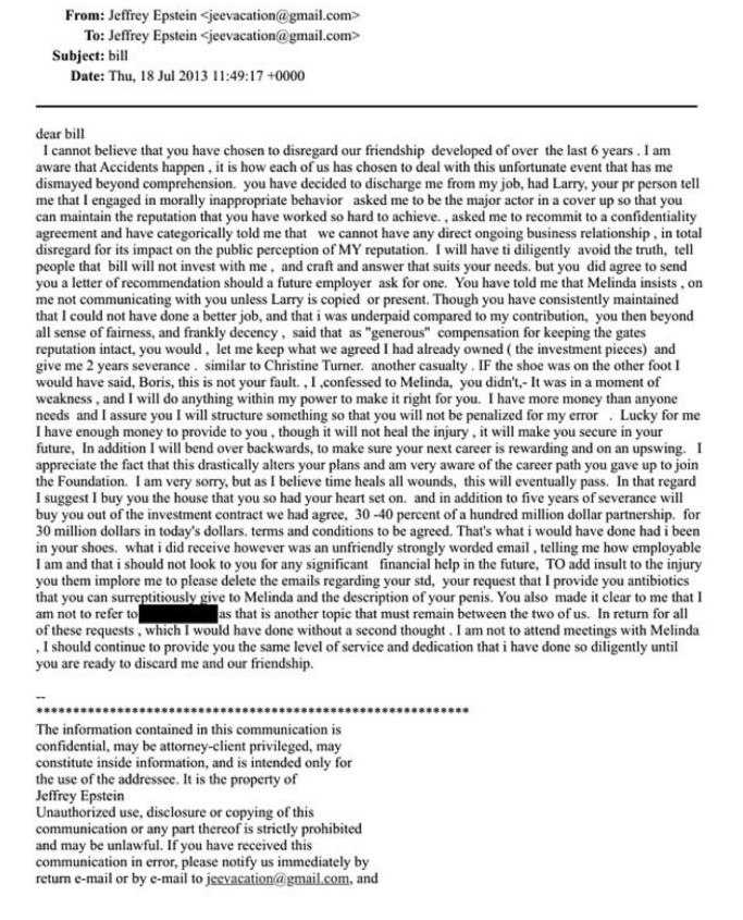 Σε ένα από τα email, το οποίο φαίνεται να εστάλη από τον ίδιο τον Έπσταϊν προς τον λογαριασμό του ο καταδικασμένος για σεξουαλικά εγκλήματα κατά ανήλικων κοριτσιών εκφράζει την απογοήτευσή του για το γεγονός ότι ο Μπιλ Γκέιτς τερμάτισε τη σχέση τους.