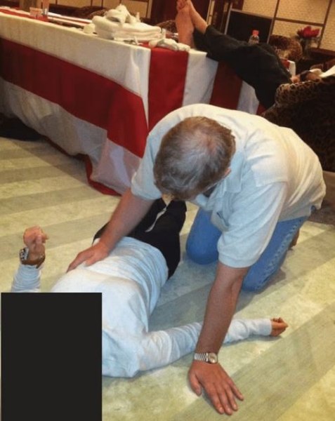 Στις φωτογραφίες επίσης φαίνεται και ένα άλλο άτομο, που κάθεται σε μια καρέκλα και έχει τα πόδια του πάνω στο τραπέζι.