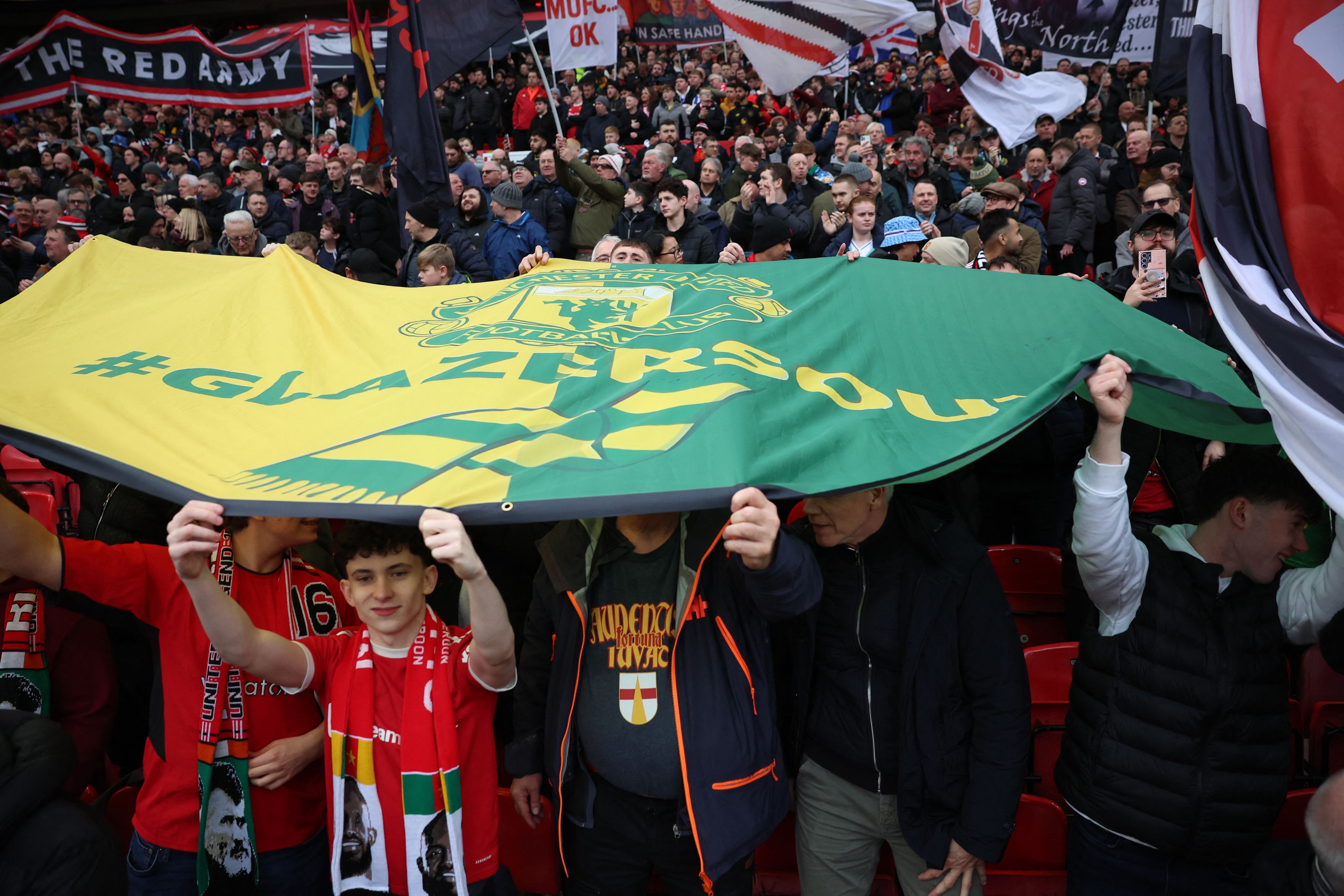 Τα συνθήματα εναντίων των Αμερικανών ιδιοκτητών του συλλόγου αλλά και κατά του Σερ Τζιμ Ράτκλιφ ήταν πολλά και φυσικά όλα είχαν να κάνουν με την επιθυμία των οπαδών της Γιουνάιτεντ για αποχώρηση των Γκλέιζερ από τα διοικητικά της ομάδας.