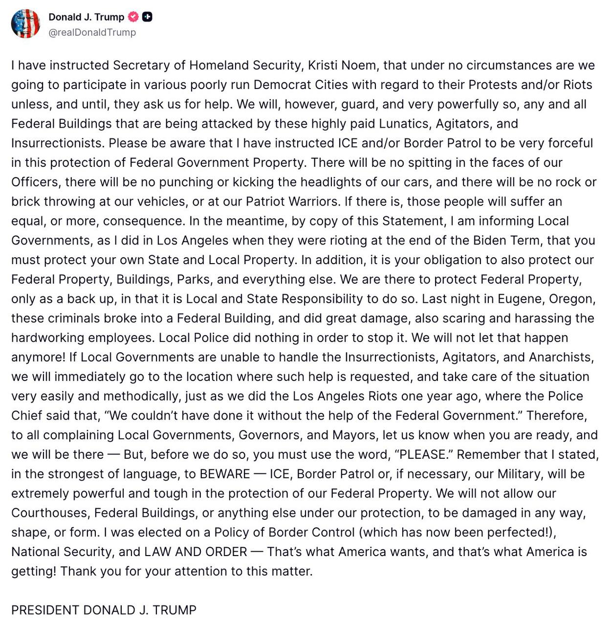 Οι πόλεις πρέπει να προστατεύουν τις δικές τους περιουσίες σε επίπεδο πολιτείας και τοπικό, έγραψε ο Τραμπ σε ανάρτησή του στα μέσα κοινωνικής δικτύωσης. Το προσωπικό της ICE και της Συνοριακής Φρουράς θα συνεχίσει να φυλάει τα ομοσπονδιακά κτίρια, έγραψε ο Τραμπ στο Truth Social.