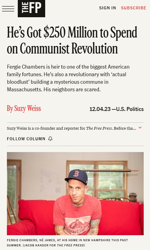 Ο 40χρονος Τζέιμς «Φέργκι» Κοξ Τσέιμπερς Τζούνιορ αποφάσισε να διαθέσει ένα «εξωφρενικό» ποσό από την κληρονομιά του για έναν σκοπό που μοιάζει βγαλμένος από τις σελίδες του Μαρξ: τη δημιουργία μιας κοινότητας στο Άλφορντ της Μασαχουσέτης.