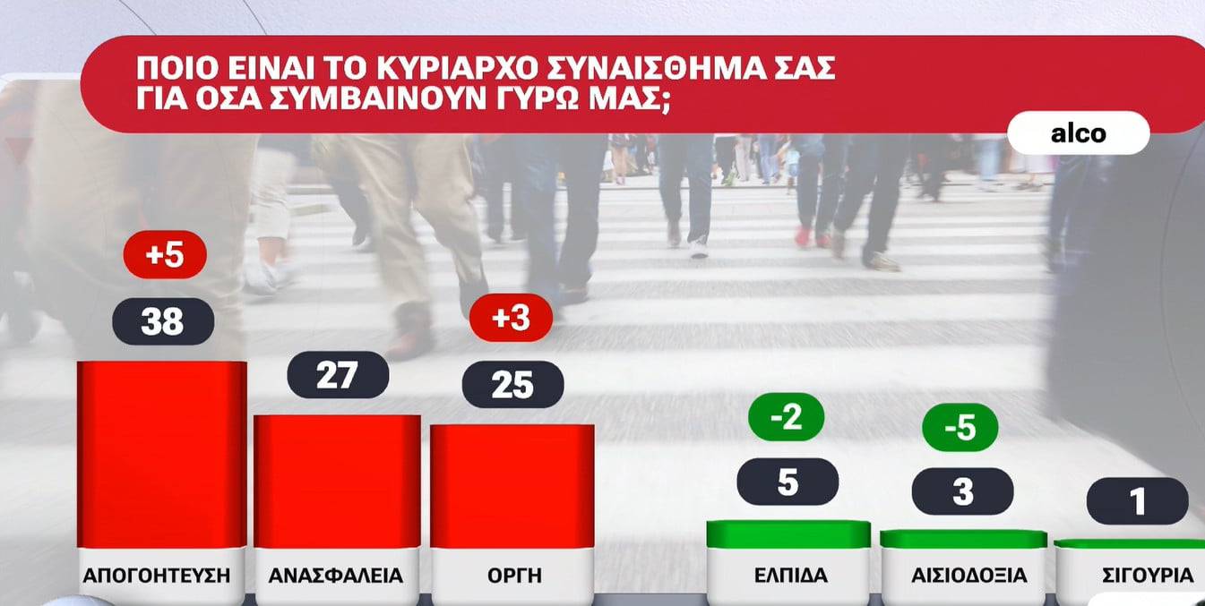 Εννιά στους δέκα εκφράζουν αρνητικά συναισθήματα για όσα συμβαίνουν γύρω μας. Το 38% εκφράζει απογοήτευση, ποσοστό πέντε μονάδες υψηλότερο από τον Ιούνιο, το 27% ανασφάλεια και το 25% οργή, αύξηση 3%.