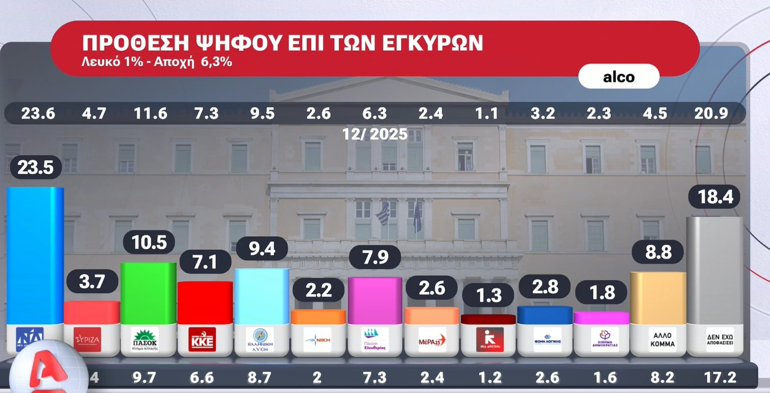 Αναλυτικά, σύμφωνα με την έρευνα της Alco, για λογαριασμό του Alpha, στην πρόθεση ψήφου επί των εγκύρων, η ΝΔ είναι στο 23,5%, δεύτερο το ΠΑΣΟΚ με 10,5%, ακολουθεί η Ελληνική Λύση με 9,4%, η Πλεύση Ελευθερίας 7,9%, το ΚΚΕ 7,1%, ο ΣΥΡΙΖΑ 3,7%, η Φωνή Λογικής 2,8%, το ΜέΡΑ25 2,6%, η Νίκη 2,2%, το Κίνημα Δημοκρατίας 1,8%, η Νέα Αριστερά 1,6%, «Άλλο Κόμμα» 8,8%, ενώ το ποσοστό των αναποφάσιστων είναι στο 18,4%.