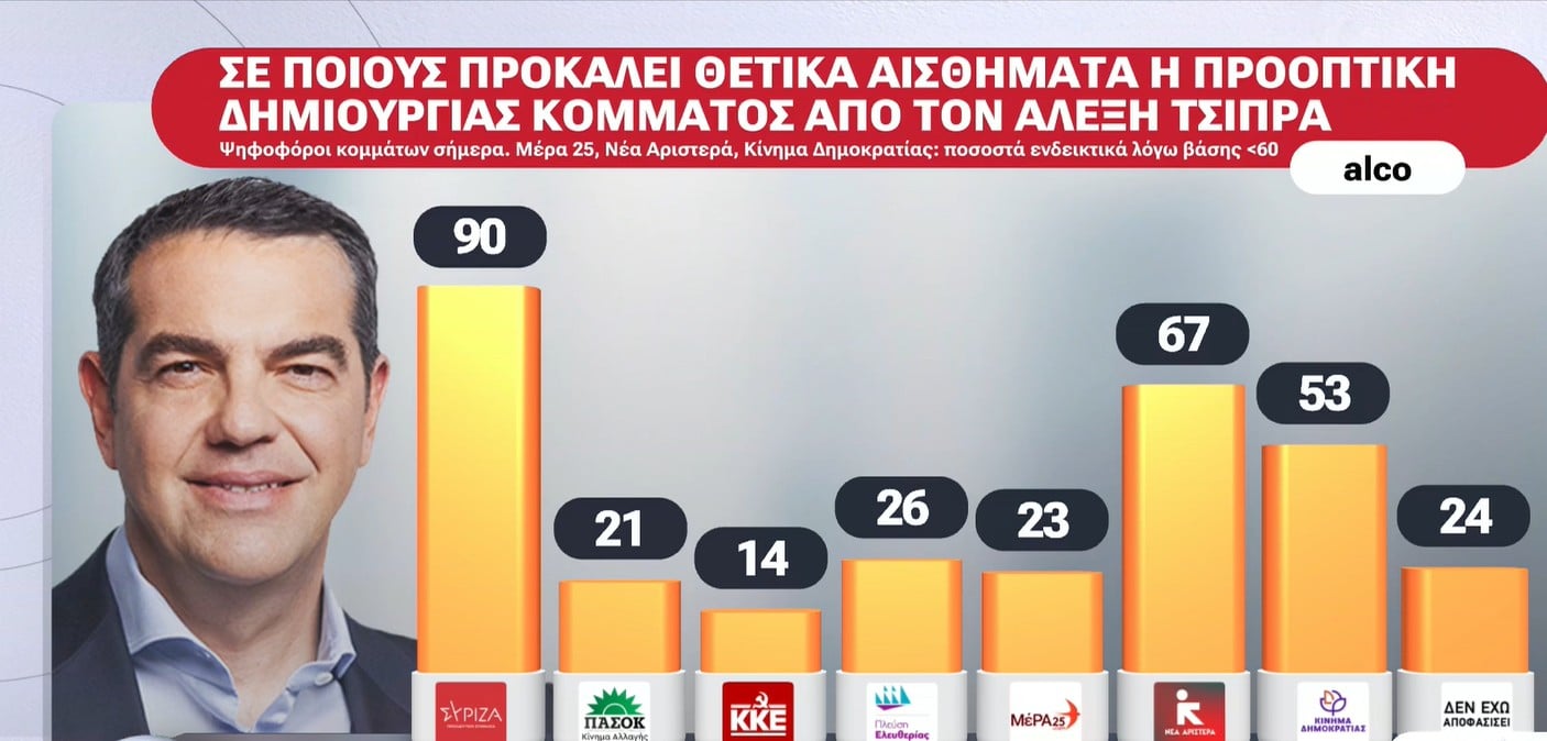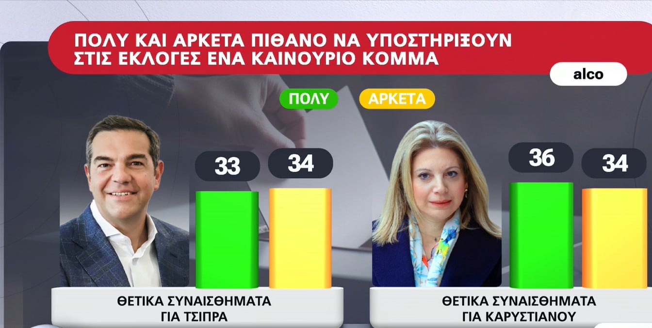 Στην προοπτική δημιουργίας «κόμματος Τσίπρα» τα «θετικά αισθήματα» όσων έλαβαν μέρος στην έρευνα φτάνουν το 17% έναντι 26% για τη Μαρία Καρυστιανού που έχει ήδη ανακοινώσει ίδρυση κόμματος και πυκνώνει τις εμφανίσεις της.