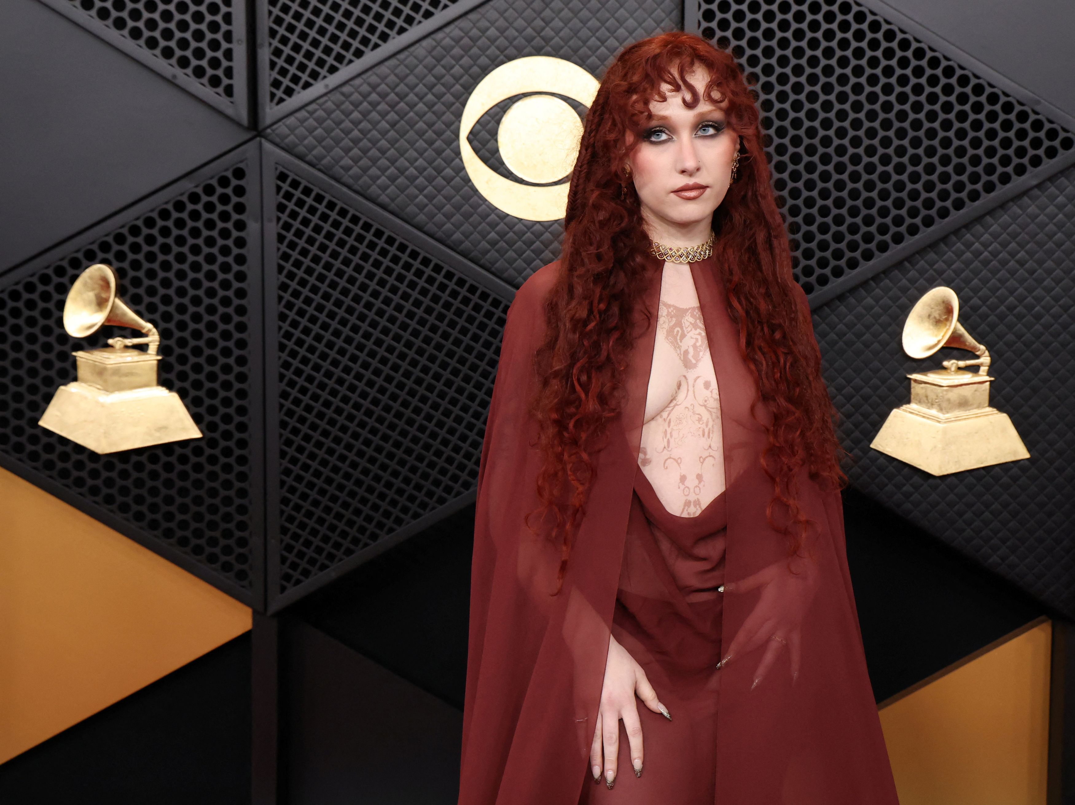 Η 27χρονη ερμηνεύτρια του «Hot to Go», Chappell Roan, έκανε μια αξέχαστη είσοδο στην φετινή τελετή των Grammy, όπου έφτασε στο κόκκινο χαλί με ένα φόρεμα trompe l’oeil του Mugler, το οποίο αποτελείτο από ένα μπούστο σε χρώμα δέρματος με ψεύτικα piercing στις θηλές και περίπλοκα τατουάζ.