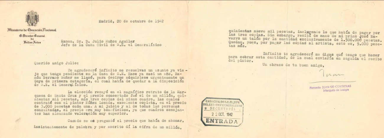 Στην επιστολή περιγράφεται αναλυτικά πώς, σχεδόν έναν χρόνο νωρίτερα, ο Ραμόν Σεράνο Σούνιερ —γαμπρός του Φράνκο και υπουργός— είχε ζητήσει την άμεση αγορά ενός «πρώτης τάξεως» Γκόγια, που θα τεθεί στη διάθεση του Generalísimo. Η επιλογή κατέληξε στο Πορτρέτο της Μαρκησίας της Σάντα Κρουθ, με τίμημα 1,5 εκατομμύριο πεσέτες, συν τρία αντίγραφα του έργου. Τα αντίγραφα ανατέθηκαν στον ζωγράφο Φρανθίσκο Νούνιεθ Λοσάδα, φημισμένο για την ικανότητά του στις αντιγραφές, έναντι 3.000 πεσετών το καθένα. Το ποσό για το πρωτότυπο καταβλήθηκε κανονικά. Οι κόπιες, όμως, έμειναν απλήρωτες.