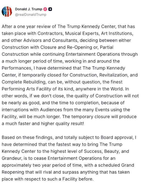 Αφορμή αποτέλεσε η ανακοίνωση του Τραμπ ότι το Kennedy Center στην Ουάσινγκτον θα κλείσει για περίπου δύο χρόνια, από τις 4 Ιουλίου, προκειμένου να πραγματοποιηθούν εκτεταμένες εργασίες «ανακατασκευής, αναζωογόνησης και πλήρους ανανέωσης».