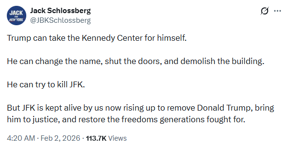 Ακόμη πιο σκληρός εμφανίστηκε ο Τζακ Σλόσμπεργκ, ο μοναδικός εγγονός του Τζον Φ. Κένεντι. Σε ανάρτησή του κατηγόρησε τον Τραμπ ότι επιχειρεί να «καταλάβει» το Kennedy Center, δηλώνοντας πως μπορεί να αλλάξει το όνομα, να κλείσει ή ακόμη και να κατεδαφίσει το κτίριο, αλλά δεν μπορεί να εξαφανίσει την πολιτική και ιστορική κληρονομιά του JFK.