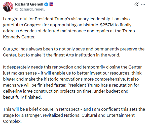 Ο Ρίτσαρντ Γκρένελ, που έχει οριστεί πρόεδρος του Kennedy Center από τον Τραμπ, υποστήριξε ότι το κλείσιμο είναι αναγκαίο και ότι ο πρόεδρος έχει αποδείξει πως μπορεί να παραδίδει μεγάλα κατασκευαστικά έργα εντός χρονοδιαγράμματος.