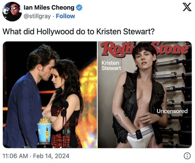 To 2024 η Στιούαρτ σόκαρε τους MAGA με το «προκλητικό» εξώφυλλο της στο Rolling Stone. Στη συνέντευξή της για το τεύχος Μαρτίου, η ηθοποιός μίλησε για την πρόθεση της να ανατρέψει τους ρόλους των φύλων με το εξώφυλλό της.