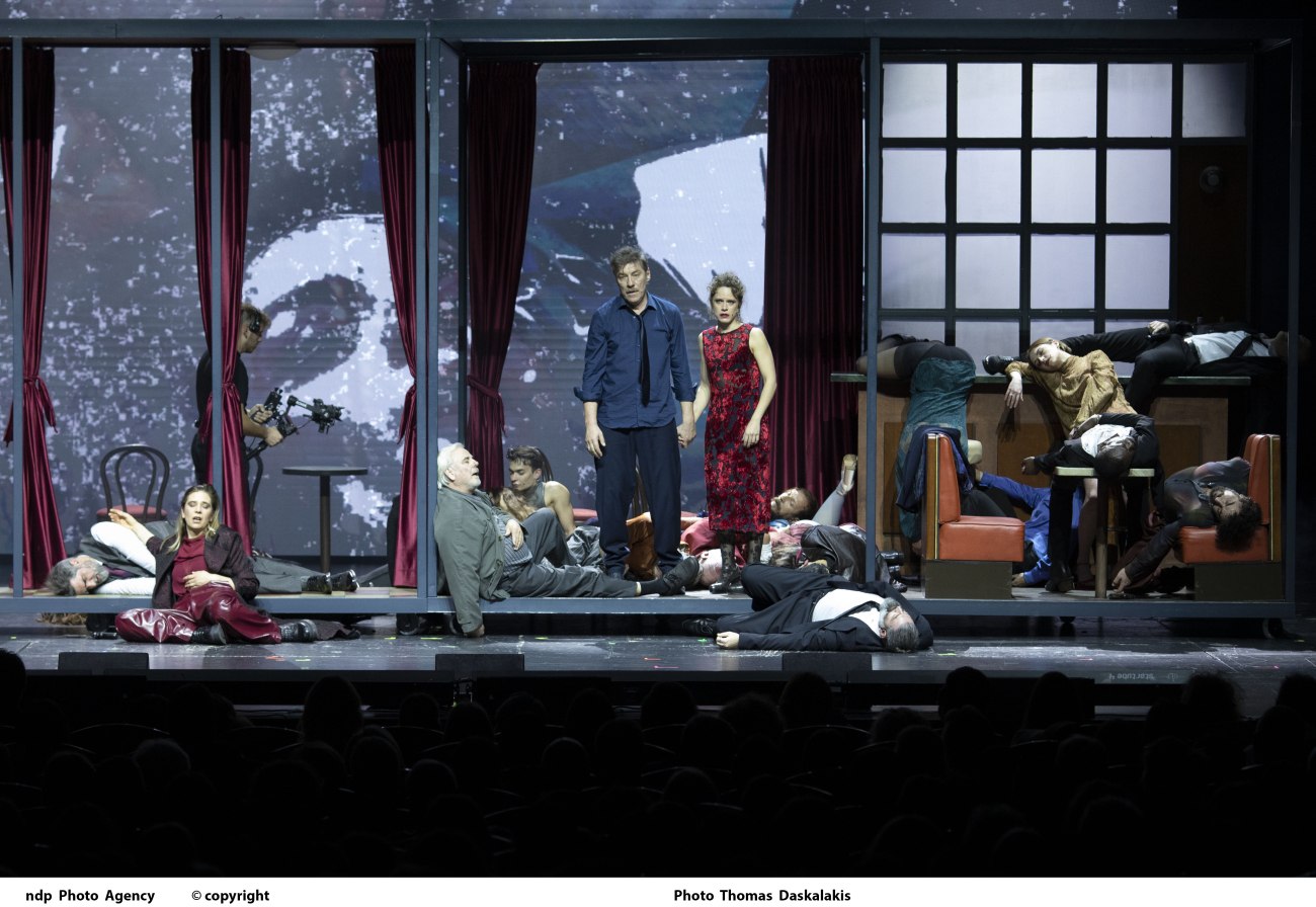 Σκηνοθετικά, η παράσταση επιλέγει να κινηθεί ανάμεσα σε δύο κόσμους. Η χρήση κάμερας και οθόνης πάνω από τη σκηνή δεν αποτελεί απλώς ένα εντυπωσιακό τέχνασμα, αλλά και μέρος της αφήγησης. Το βλέμμα πλησιάζει τους ηθοποιούς, τα πρόσωπα γεμίζουν το κάδρο, τα συναισθήματα γίνονται πιο ξεκάθαρα από ποτέ. Κάποιες στιγμές έχεις την αίσθηση ότι παρακολουθείς ταυτόχρονα θέατρο και κινηματογράφο — και αυτό λειτουργεί υπέρ της ιστορίας.