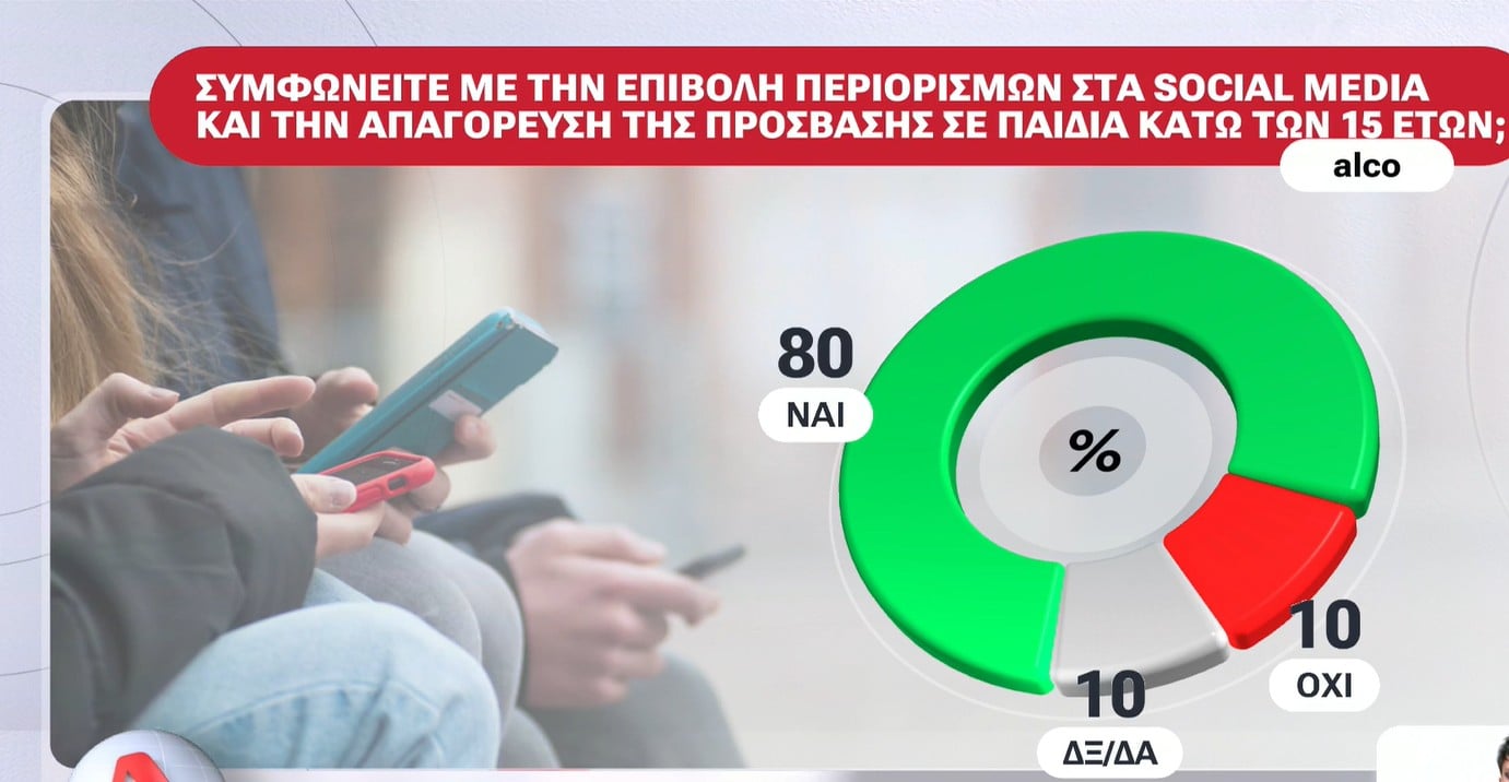 Στην ίδια δημοσκόπηση, σε ερώτηση στους συμμετέχοντες αν συμφωνούν με την επιβολή περιορισμών στα social media και την απαγόρευση της πρόσβασης σε παιδιά κάτω των 15 ετών, το 80% απαντά «Ναι», με το 10% να λέει «Όχι» και ένα 10% να απαντά «Δεν ξέρω/δεν απαντώ».