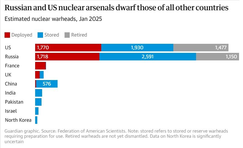 Τα πυρηνικά οπλοστάσια της Ρωσίας και των ΗΠΑ επισκιάζουν αυτά όλων των άλλων χωρών – Εκτιμώμενος αριθμός πυρηνικών κεφαλών, Ιανουάριος 2025