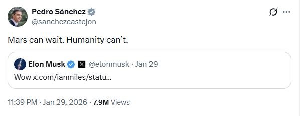 Ο απόηχος των ενεργειών της ισπανικής κυβέρνησης έφτασε στις ΗΠΑ. Ο γνωστός για τις αντιμεταναστευτικές και ακροδεξιές θέσεις του, Έλον Μασκ έσπευσε να υιοθετήσει σχόλιο που απέδιδε στον πρωθυπουργό της Ισπανίας, «εκλογική μηχανορραφία». Και ένα ειρωνικό σχόλιο θαυμασμού: «Ουάου!»