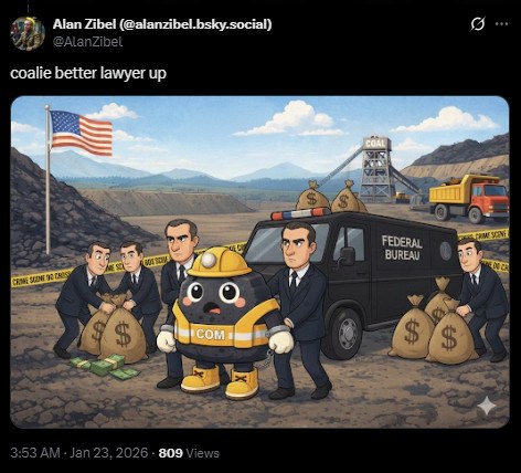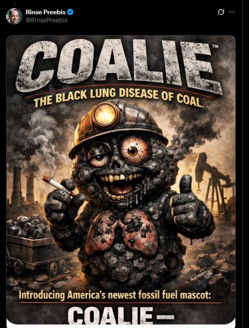 Επιμένοντας στην απροκάλυπτη προπαγάνδα της ατζέντας της με όρους μέσων κοινωνικής δικτύωσης, η κυβέρνηση Τραμπ φαίνεται πως βρήκε ένα ασυνήθιστο όπλο στην προσπάθειά της να αναστήσει τη βιομηχανία εξόρυξης άνθρακα στο καρτούν σε σχήμα κομματιού άνθρακα που φέρει μεγάλα μάτια και είναι ντυμένο με μια κίτρινη στολή ανθρακωρύχου.