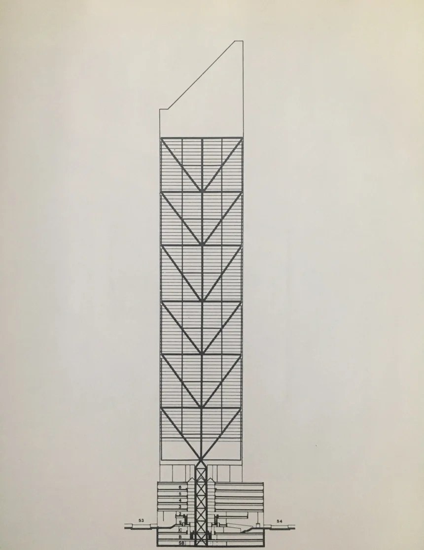 Μια τομή του πύργου που δείχνει το καινοτόμο σύστημα ενίσχυσης σε σχήμα V του LeMessurier (Photo Michael Greenburg)