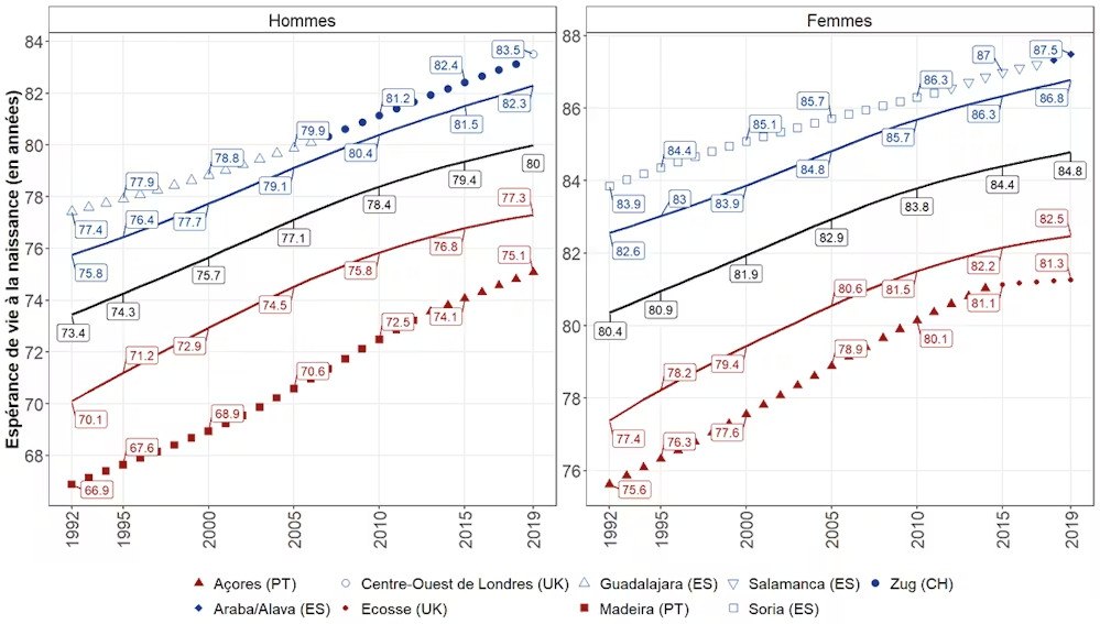 Οι περιοχές με το υψηλότερο προσδόκιμο ζωής (σημαντικές περιοχές της Βόρειας Ιταλίας, Ελβετίας και Ισπανίας) συνεχίζουν να καταγράφουν αύξηση περίπου δυόμισι μηνών ετησίως για τους άνδρες και ενάμισι μήνα για τις γυναίκες.