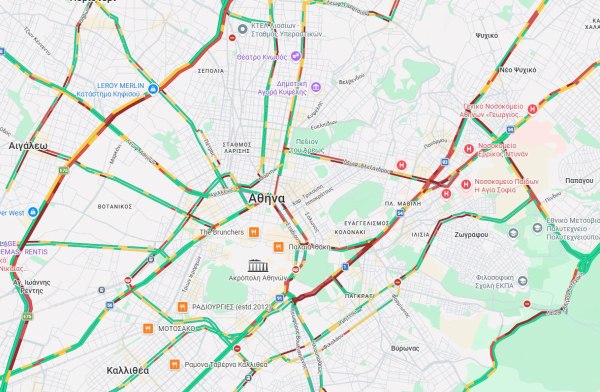 Στο κόκκινο βρίσκονται τα δύο ρεύματα του Κηφισού, η Κηφισίας η Μεσογείων, η Αλεξάνδρας, η Αρδηττού, η Καλλιρρόης, η Πανεπιστημίου, η Σταδίου, η Λεωφόρος Αθηνών από Χαϊδάρι μέχρι Σκαραμαγκά, στο ρεύμα καθόδου, ενώ και η Αττική Οδός παρουσιάζει καθυστερήσεις.