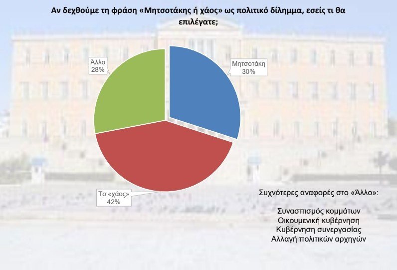 Από την παραπάνω δημοσκόπηση προκύπτει ένα πολύ ενδιαφέρον συμπέρασμα: οι πολίτες, όταν βρέθηκαν αντιμέτωποι με ένα τέτοιο ερώτημα, είχαν προτιμήσει… το χάος. Η δήλωση λοιπόν του Πρωθυπουργού πως «δεν θα συγκριθώ με το χάος, θα συγκριθώ με τους πολιτικούς μου αντιπάλους», εύλογα σε βάζει σε σκέψεις.