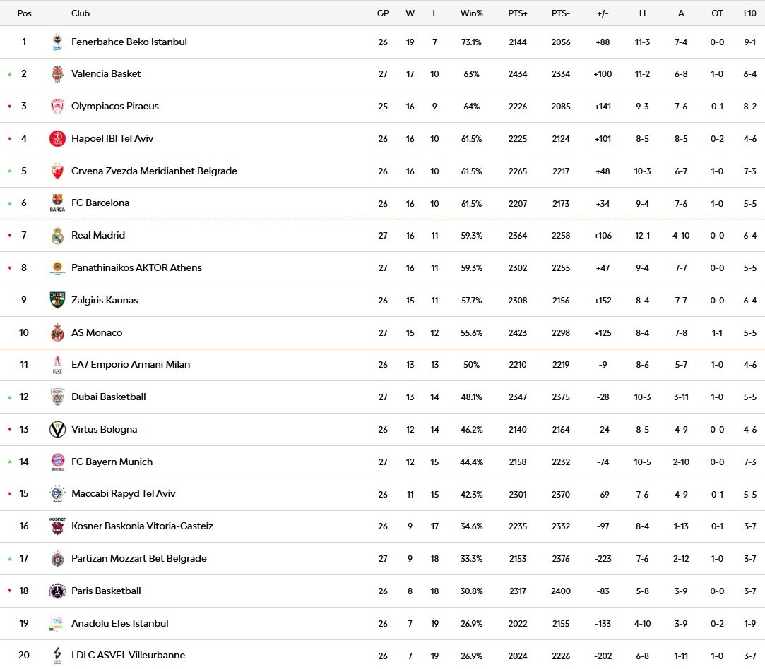 Το πρόγραμμα και τα αποτελέσματα της 27ης αγωνιστικής Euroleague