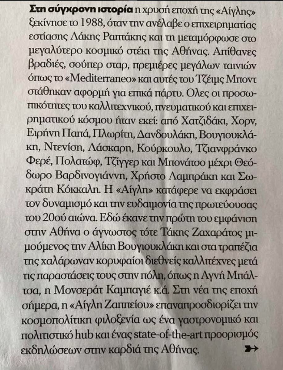 Το όνομα του πειράματος; Αίγλη. Ένα μυθικό στέκι στο κέντρο της Αθήνας, από το οποίο θα παρελάσουν όλα τα μεγάλα ονόματα made in Greece – και πολλά του εξωτερικού. Από την Αλίκη Βουγιουκλάκη, τον Δημήτρη Χορν, την Ειρήνη Παπά, τον Μάνο Χατζιδάκι, την Κάτια Δανδουλάκη μέχρι τον Τζιανφράνκο Φερέ και την Μονσεράτ Καμπαγιέ.