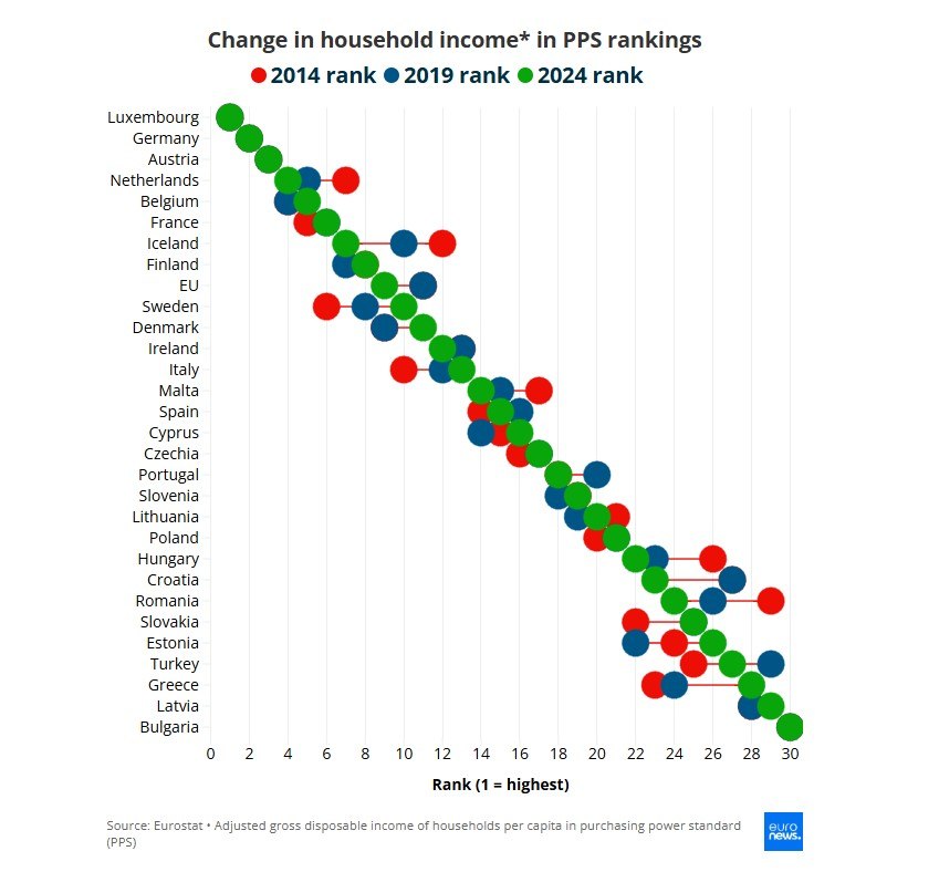 Πάνω από 30.000 PPS καταγράφουν το Βέλγιο, η Γαλλία, η Ισλανδία και η Νορβηγία. Η Βουλγαρία έχει το χαμηλότερο κατά κεφαλήν εισόδημα νοικοκυριού με 7.802 PPS (στοιχεία του 2022).