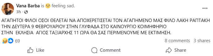 «Αγαπητοί φίλοι, όσοι θέλετε να αποχαιρετήσετε τον αγαπημένο μας φίλο Λάκη Ραπτάκη, τη Δευτέρα 9 Φεβρουαρίου, στη Γλυφάδα, στην εκκλησία του Αγίου Ταξιάρχη, στις 11:00. Θα σας περιμένουμε», έγραψε σε ανάρτησή της στο Facebook.