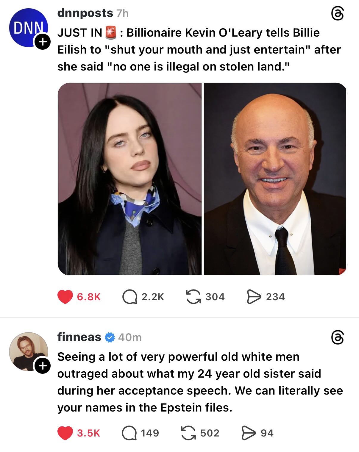 Την απάντηση σε αυτή την προτροπή, την έδωσε ο αδερφός της τραγουδίστριας Finneas, ο οποίος την υπερασπίστηκε, γράφοντας στο Threads: «Βλέπω πολλούς ισχυρούς ηλικιωμένους λευκούς άνδρες να εξοργίζονται για τα λόγια της 24χρονης αδελφής μου κατά τη διάρκεια της ομιλίας της για την απονομή του βραβείου. Είμαι σίγουρος ότι θα δούμε τα ονόματά σας στο αρχείο Έπσταιν».