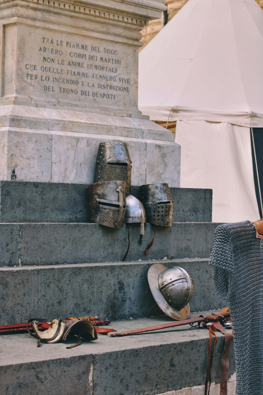 κρεμασμένη με κράνη, βαριές πολεμικές ασπίδες