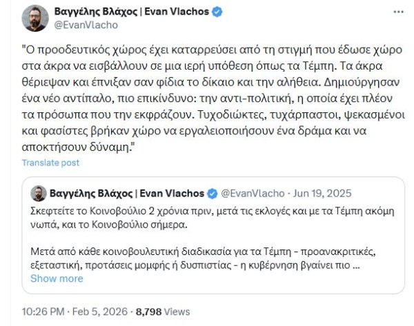 «Ο προοδευτικός χώρος έχει καταρρεύσει από τη στιγμή που έδωσε χώρο στα άκρα να εισβάλλουν σε μια ιερή υπόθεση όπως τα Τέμπη. Τα άκρα θέριεψαν και έπνιξαν σαν φίδια το δίκαιο και την αλήθεια. Δημιούργησαν ένα νέο αντίπαλο, πιο επικίνδυνο: την αντι-πολιτική, η οποία έχει πλέον τα πρόσωπα που την εκφράζουν. Τυχοδιώκτες, τυχάρπαστοι, ψεκασμένοι και φασίστες βρήκαν χώρο να εργαλειοποιήσουν ένα δράμα και να αποκτήσουν δύναμη».