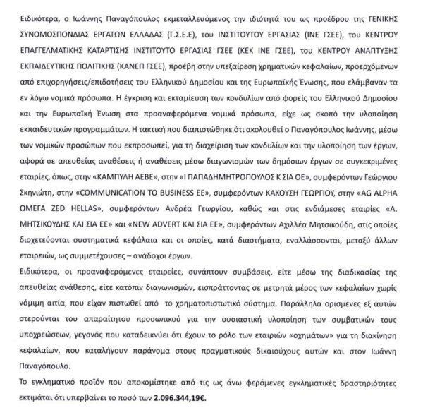 Αναλυτικότερα και πάντα σύμφωνα με την Αρχή, ο κ. Παναγόπουλος, εκμεταλλευόμενος την ιδιότητά του ως προέδρου της ΓΣΕΕ και συγκεκριμένων ΚΕΚ προέβη σε υπεξαίρεση χρηματικών κεφαλαίων που προέχονταν από επιδοτήσεις εθνικών και ευρωπαϊκών πόρων. Εν συνεχεία διοχέτευε τα κεφάλαια μέσω αναθέσεων στις εταιρείες που εμπλέκονται στην υπόθεση παρά το γεγονός ότι ορισμένες εξ αυτών στερούνταν του απαιτούμενου προσωπικού για τα υποτιθέμενα έργα, γεγονός που σημαίνει ότι εμφανίζονταν ως εταιρείες-οχήματα για τη διακίνηση των κεφαλαίων, τα οποία εν συνεχεία κατέληγαν στους πραγματικούς δικαιούχους, αλλά και στον ίδιο τον πρόεδρο της ΓΣΕΕ.