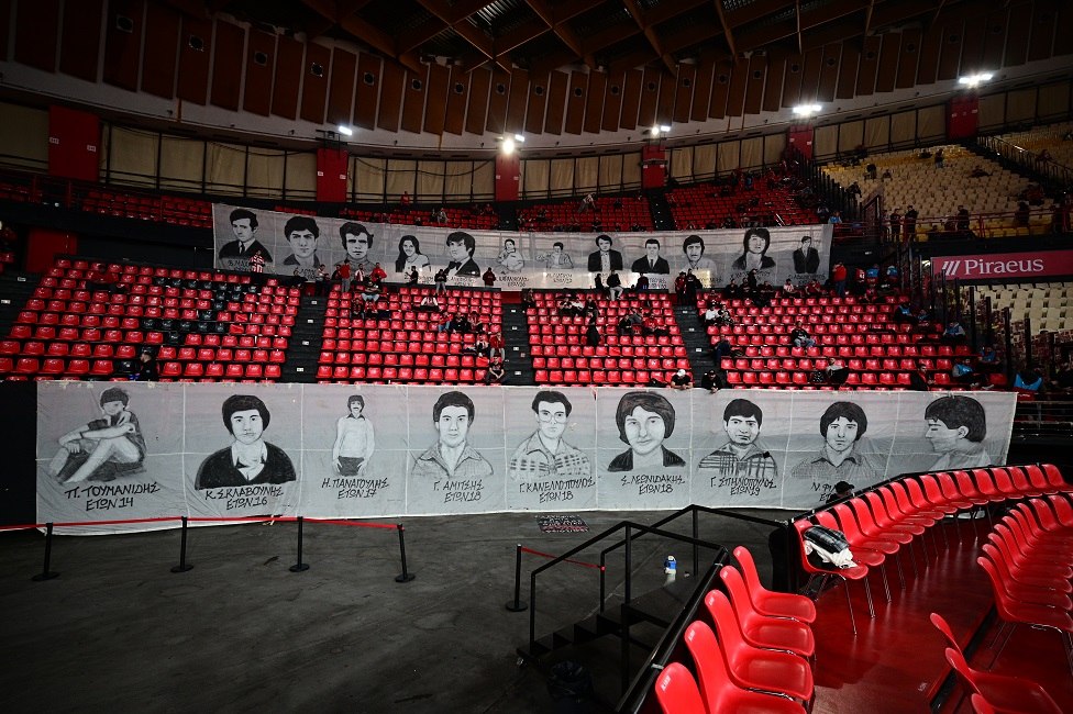 Πριν από το τζάμπολ της αναμέτρησης με την Βίρτους Μπολόνια για την 27η αγωνιστική της Euroleague, οι φίλοι του Ολυμπιακού σήκωσαν το καθιερωμένο πανό με τα ονόματα των 21 θυμάτων.