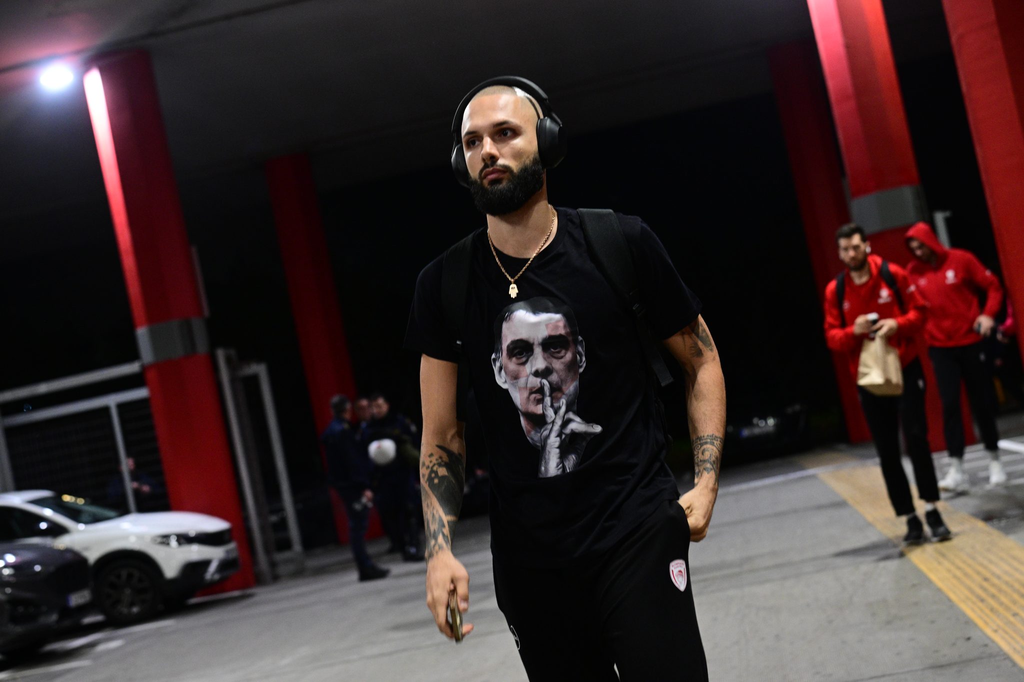 Ο Γάλλος σούπερ σταρ έφτασε στο ΣΕΦ για το παιχνίδι των Πειραιωτών με την Βίρτους Μπολόνια (21:15), φορώντας μπλουζάκι που είχε πάνω του το πρόσωπο του Γιώργου Μπαρτζώκα.