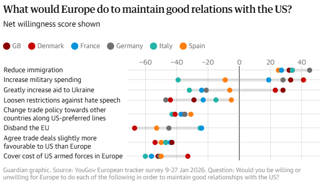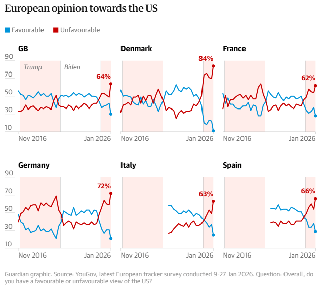 Όπως σημειώνει ο Guardian, που παρουσιάζει και σε γραφήματα τα αποτελέσματα της δημοσκόπησης, οι απειλές του Αμερικανού προέδρου κατά της Γροιλανδίας έχουν ρίξει στα τάρταρα τα ποσοστά συμπάθειας προς τις ΗΠΑ.