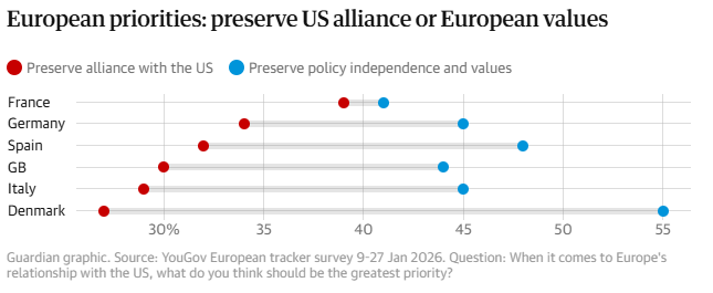 Ο Guardian σημειώνει ότι η δημοσκόπηση δείχνει ότι πολλοί Ευρωπαίοι (από 39% στη Γερμανία έως 57% στη Δανία) εξακολουθούν να πιστεύουν ότι η εξωτερική πολιτική των ΗΠΑ θα «επιστρέψει στο φυσιολογικό» μόλις ο Τραμπ αποχωρήσει από το προσκήνιο.