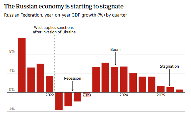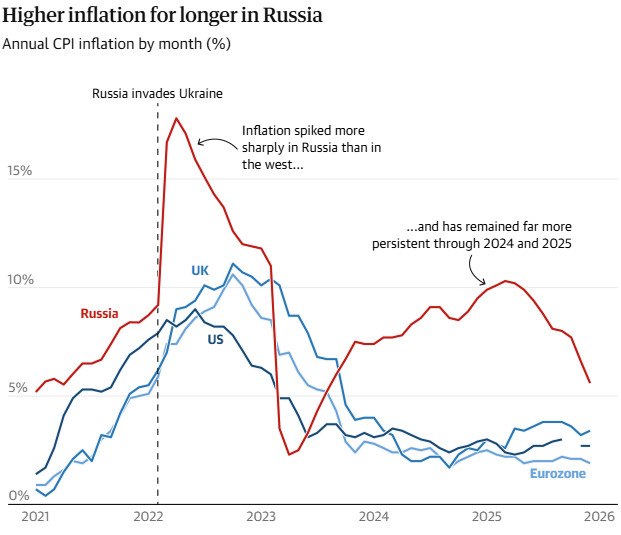Γραφικό του Guardian. Πηγή: Ρωσική Ομοσπονδιακή Στατιστική Υπηρεσία, Eurostat, Γραφείο Εθνικών Στατιστικών του Ηνωμένου Βασιλείου και Ομοσπονδιακή Τράπεζα των ΗΠΑ. Σημείωση: Τα στοιχεία για τον πληθωρισμό στις ΗΠΑ για τον Οκτώβριο του 2025 δεν είναι διαθέσιμα λόγω της διακοπής λειτουργίας της κυβέρνησης.