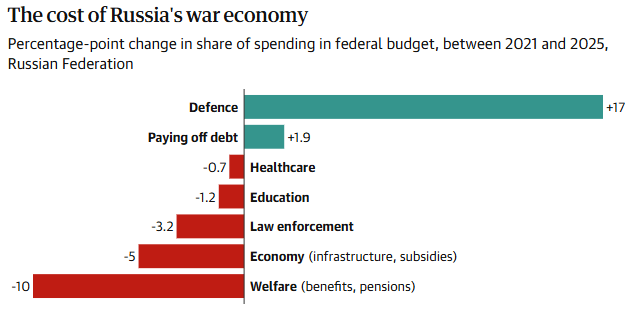Γραφικό του Guardian. Πηγή: Τα στοιχεία για το 2025 προέρχονται από το άρθρο «Πόσο ανθεκτική είναι η οικονομία της Ρωσίας μετά από τέσσερα χρόνια πολέμου;», Marek Dabrowski, Δεκέμβριος 2025. Τα στοιχεία για το 2021 προέρχονται από το ρωσικό υπουργείο Οικονομικών. Τα στοιχεία και για τα δύο έτη αντιπροσωπεύουν τις προγραμματισμένες δαπάνες.