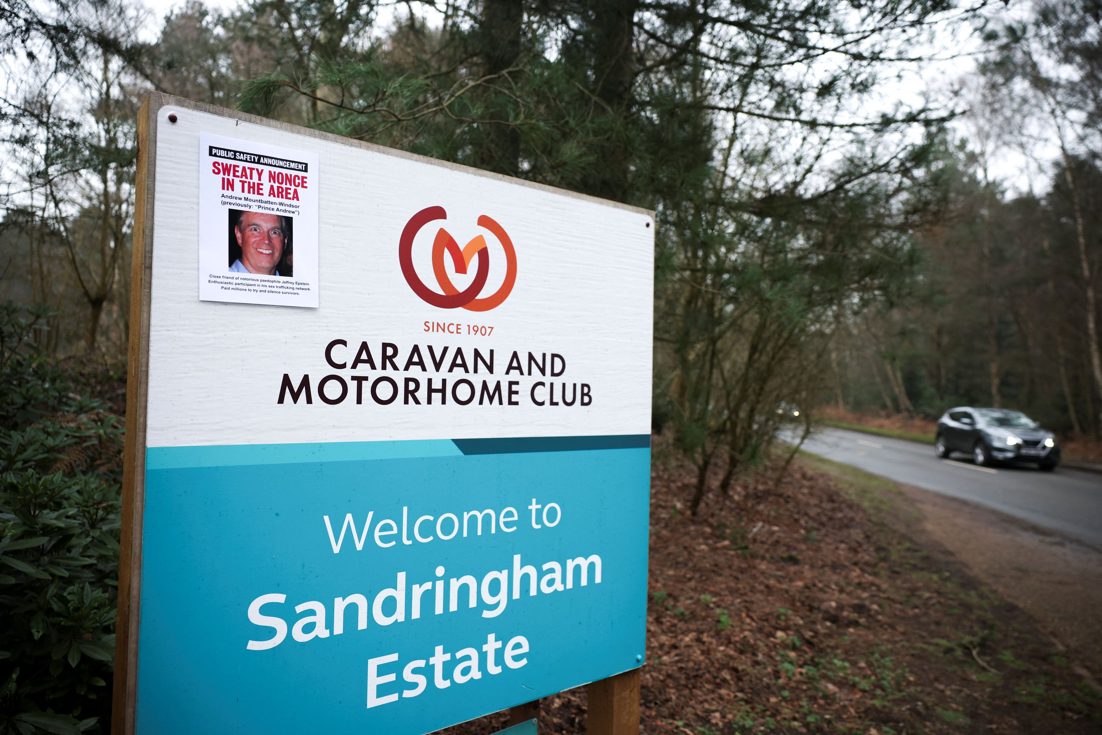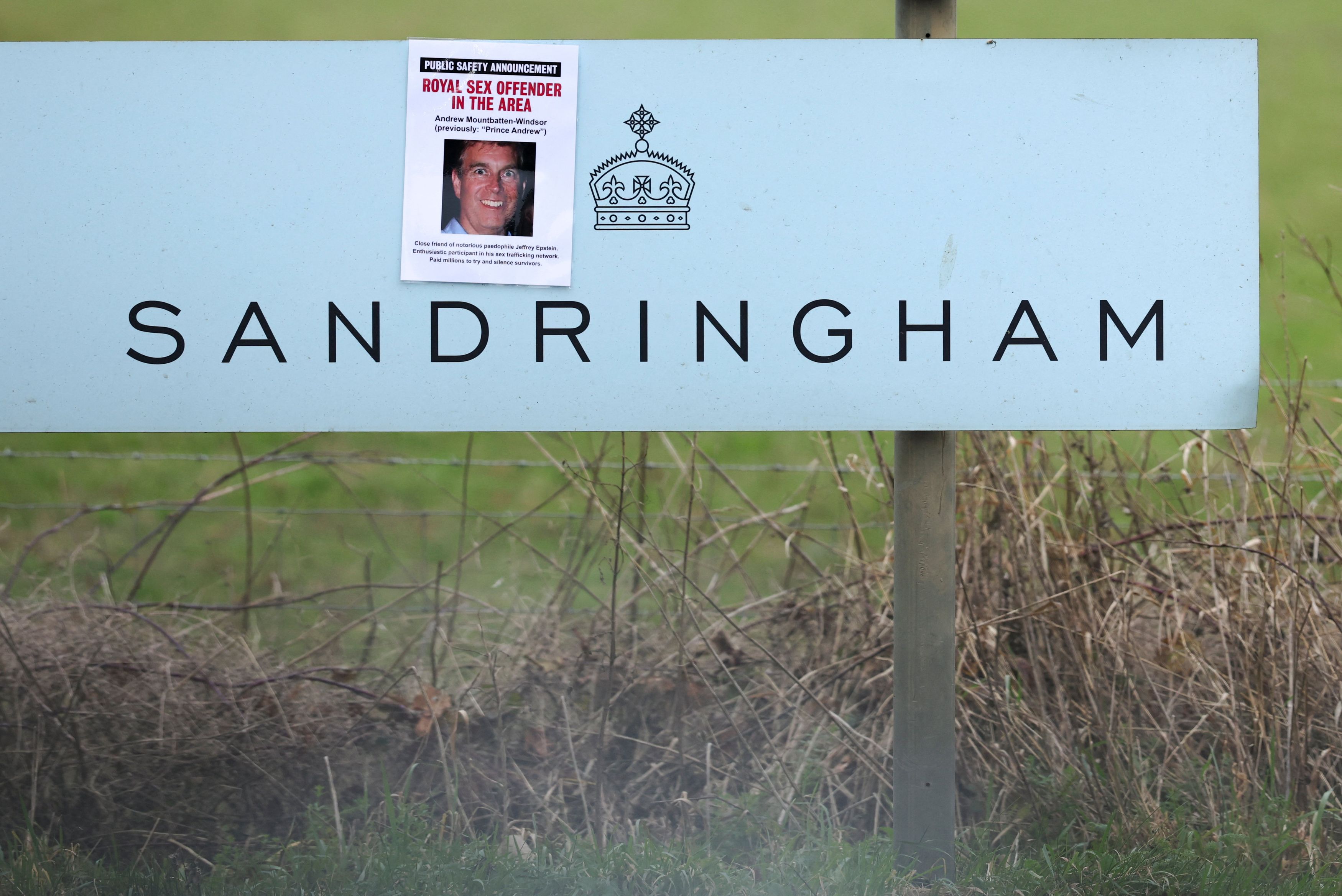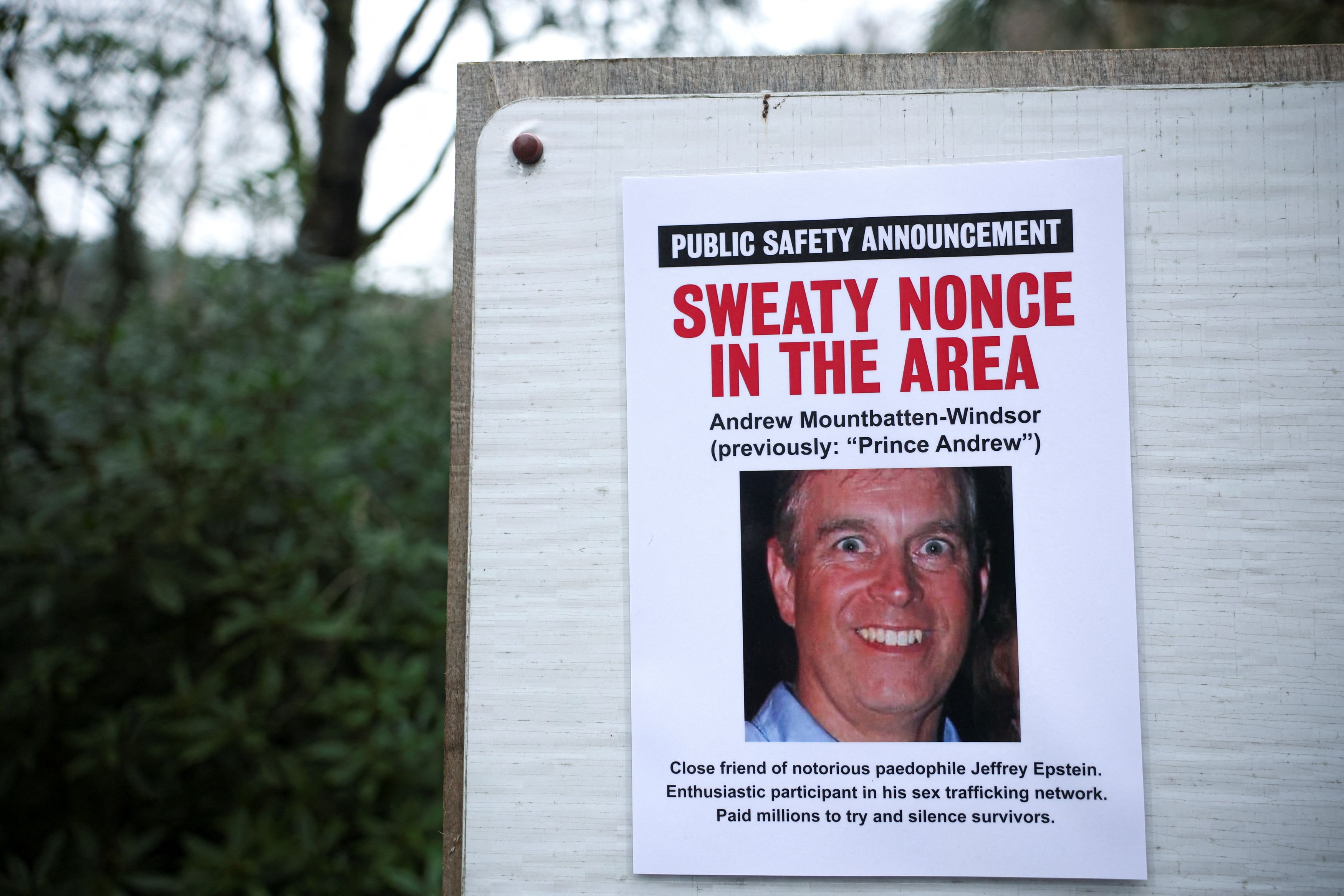 Αφίσα της καμπάνιας Everyone Hates Elon με τον Άντριου Μάουντμπάτεν-Ουίνδσορ, πρώην γνωστό ως πρίγκιπα Άντριου, έχει τοποθετηθεί σε πινακίδα που καλωσορίζει τους επισκέπτες στο Sandringham Estate, καθώς εντείνονται οι πιέσεις να καταθέσει, μετά τη δημοσιοποίηση νέων εγγράφων από το Υπουργείο Δικαιοσύνης των ΗΠΑ που συνδέονται με τον εκλιπόντα παιδοβιαστή Τζέφρι Έπσταϊν, στο Νόρφολκ, Βρετανία, 5 Φεβρουαρίου 2026. REUTERS/Isabel Infantes