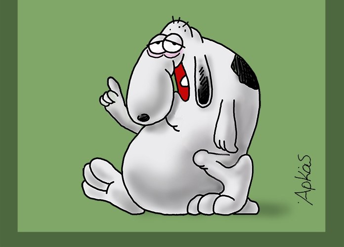 Στο σημερινό σκίτσο βλέπουμε έναν σκύλο, καθισμένο χαλαρά, με μισόκλειστα μάτια και υψωμένο το ένα δάχτυλο, σαν να δίνει ένα μάθημα ζωής.