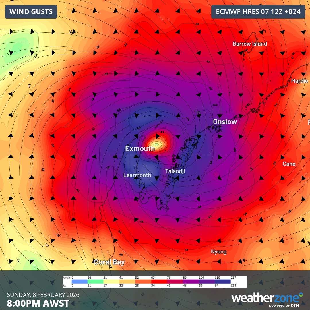 Η πρόγνωση επισημαίνει πολύ καταστροφικούς ανέμους μεταξύ Ντάμπιερ και Μάρντι νωρίς την Κυριακή, με καταστροφικές ριπές ανέμου που εκτείνονται νότια προς το Έξμουθ, μαζί με ισχυρές βροχές, πλημμύρες και ασυνήθιστα υψηλές παλίρροιες που θα επηρεάσουν μέρος της δυτικής Αυστραλίας.