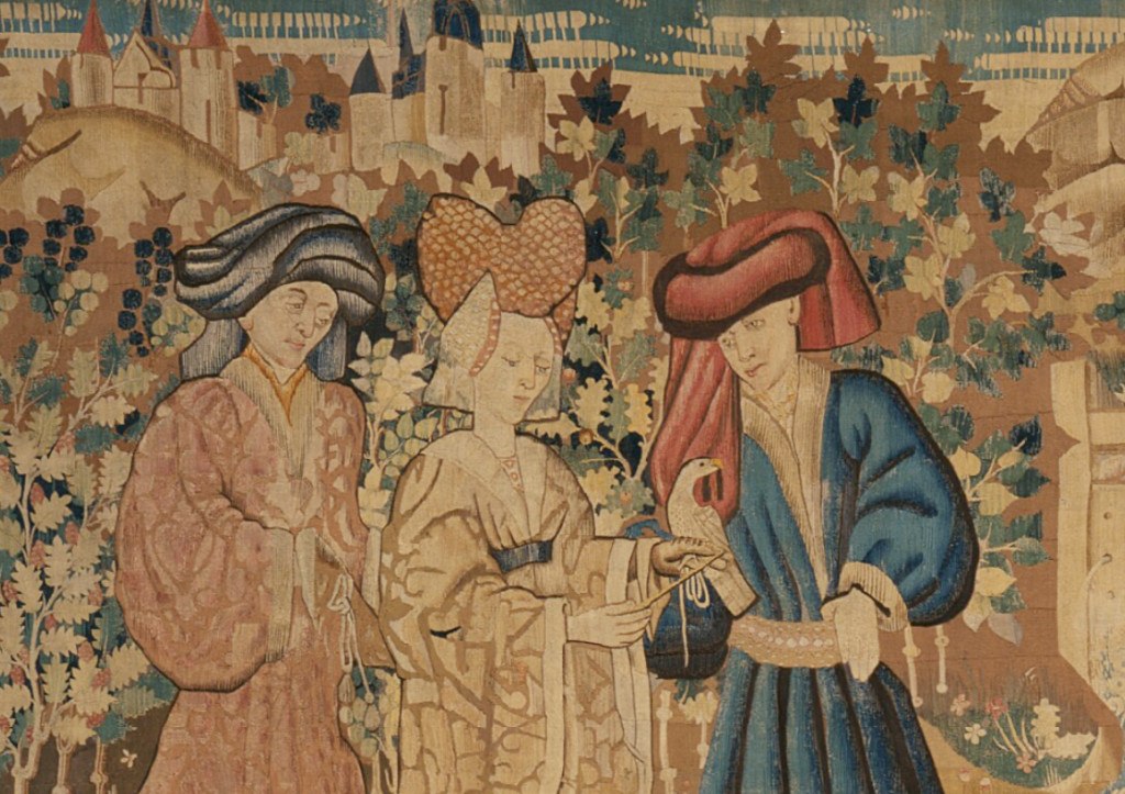 Χαρακτηριστικό παράδειγμα αποτελούν οι περίφημες Devonshire Hunting Tapestries του 15ου αιώνα, όπου ερωτευμένα ζευγάρια απεικονίζονται να περιδιαβαίνουν το τοπίο, ενώ τα γεράκια τους καταδιώκουν το θήραμα. Αντίστοιχα, μικρότερης κλίμακας αντικείμενα, όπως θήκες καθρεφτών του 14ου αιώνα, παρουσιάζουν εραστές έφιππους, με γεράκια στο χέρι — πιθανότατα δώρα αγάπης.