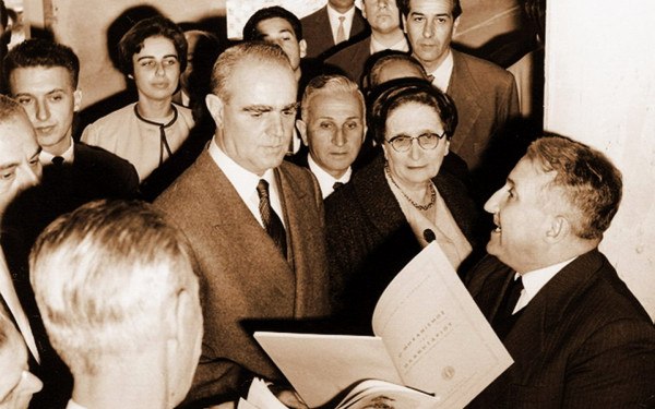 Ο Δημήτριος Κωτσάκης και η Μαριάνθη Σίμου ξεναγούν τον Κωνσταντίνο Καραμανλή στο υπό ανέγερση κτίριο του Πλανηταρίου (1962)