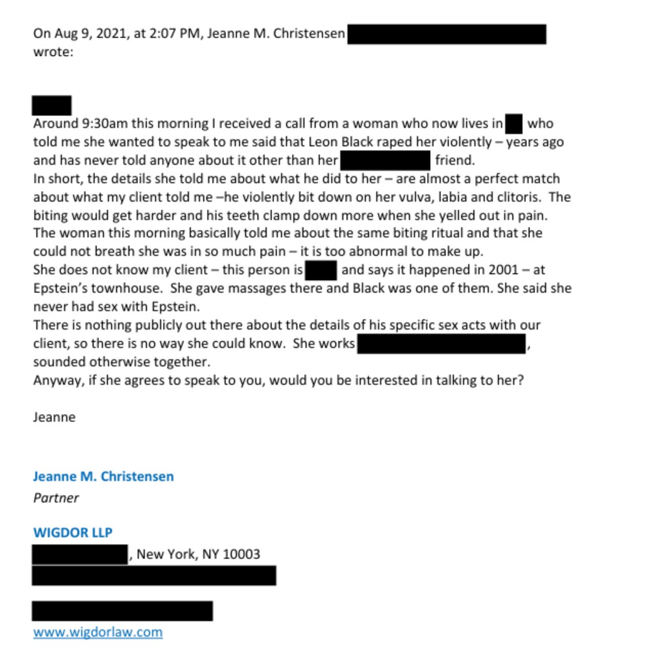 Ιδιαίτερη βαρύτητα δίνουν τα αρχεία σε σημειώσεις και αλληλογραφία της δικηγόρου Τζιν Κρίστενσεν, η οποία εκπροσωπούσε τόσο την Jane Doe όσο και άλλη γυναίκα που έχει κατηγορήσει τον Μπλακ για σεξουαλική κακοποίηση. Εκεί καταγράφεται ένα επαναλαμβανόμενο μοτίβο βίας, με εξαιρετικά συγκεκριμένες λεπτομέρειες — μεταξύ άλλων, καταγγελίες για δαγκώματα στα γεννητικά όργανα, αιμορραγία, εξευτελισμό και άρνηση ιατρικής φροντίδας.