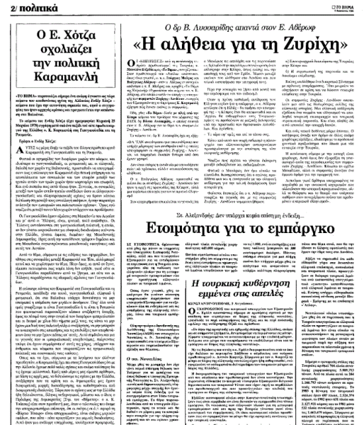 Ο Βάσος Λυσσαρίδης (1920-2021), πρόεδρος της ΕΔΕΚ (Ενιαίας Δημοκρατικής Ένωσης Κέντρου), είχε απαντήσει με το κείμενο αυτό στον Ευάγγελο Αβέρωφ – Τοσίτσα, ο οποίος είχε νωρίτερα εξηγήσει, με άρθρα του που είχαν επίσης δημοσιευτεί στο «Βήμα», το πώς είχαν συναφθεί οι Συμφωνίες Ζυρίχης και Λονδίνου.