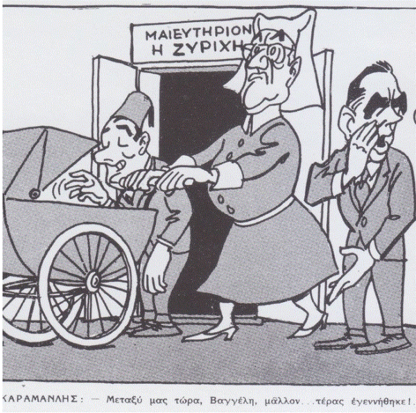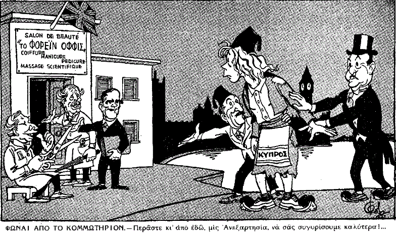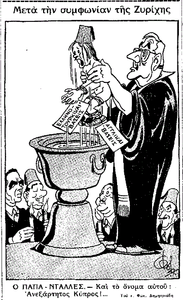 Στην κεντρική φωτογραφία του παρόντος άρθρου, σκίτσο του Φωκίωνος Δημητριάδη που είχε δημοσιευτεί στην εφημερίδα «Το Βήμα» την Κυριακή 15 Φεβρουαρίου 1959, λίγες ημέρες μετά την υπογραφή της Συμφωνίας της Ζυρίχης.