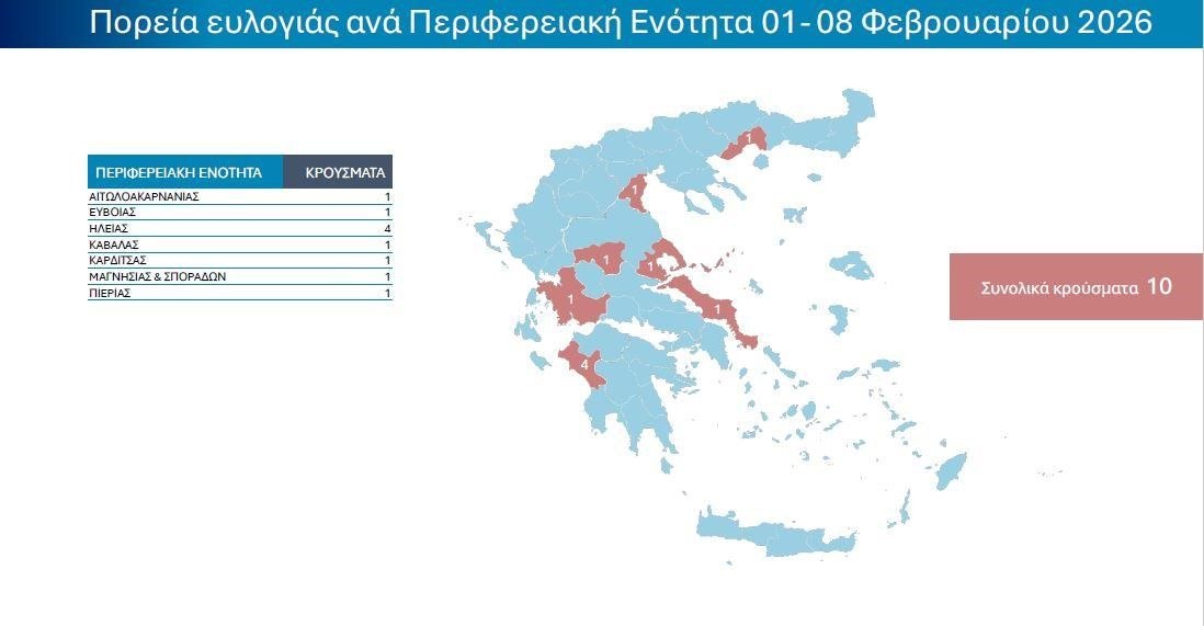 Για την περίοδο 01–08 Φεβρουαρίου 2026, καταγράφηκαν 10 νέα κρούσματα σε 7 Περιφερειακές Ενότητες