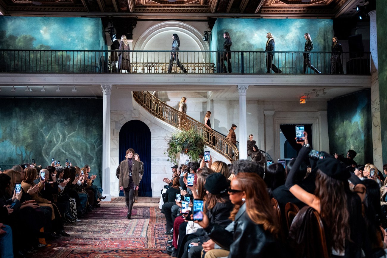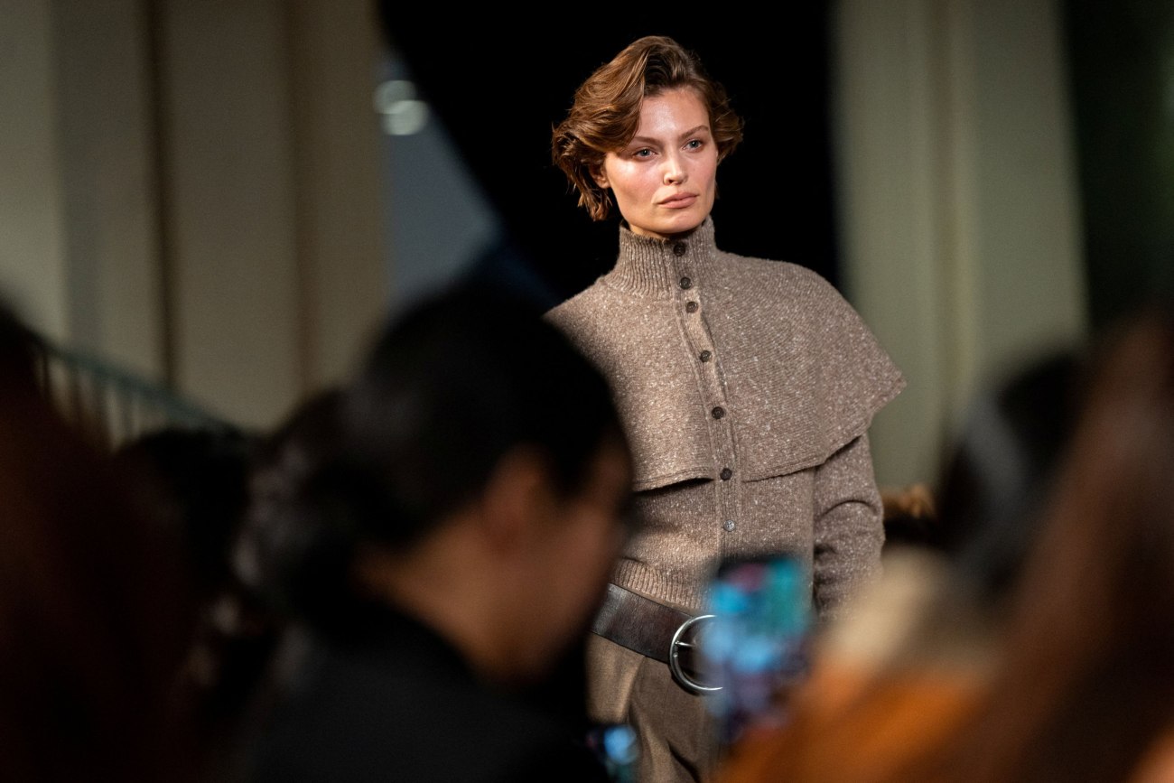 Ένα επαγγελματικό σύνολο με μακρύ παλτό και παντελόνι αντισταθμίστηκε από ένα πολυτελές σάλι με λεοπάρ μοτίβο, ενώ ένα άνετο πλεκτό πουλόβερ διακοσμήθηκε με μεταλλικά κεντήματα και χάντρες. Το τελευταίο ήταν ένα από τα πολλά στοιχεία που εμφανίστηκαν στη συλλογή και θύμιζαν πανοπλία – από μια διαφανή κουκούλα που λάμπει σαν αλυσιδωτή προστασία και βραδινά φορέματα με ιπποτική λάμψη, μέχρι ένα ασημένιο σακάκι με έντονους ώμους που θύμιζε μεσαιωνικό ρομαντισμό με μια πινελιά από το στυλ του Μανχάταν.