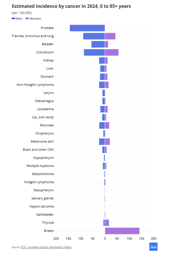 Σύμφωνα με το euronews, η συχνότητα εμφάνισης καρκίνου μεταξύ των νέων γυναικών αυξάνεται ιδιαίτερα γρήγορα: εκτιμάται ότι το 2024 διαγνώστηκαν με καρκίνο 2,4 γυναίκες και 2,8 άνδρες κάθε λεπτό.