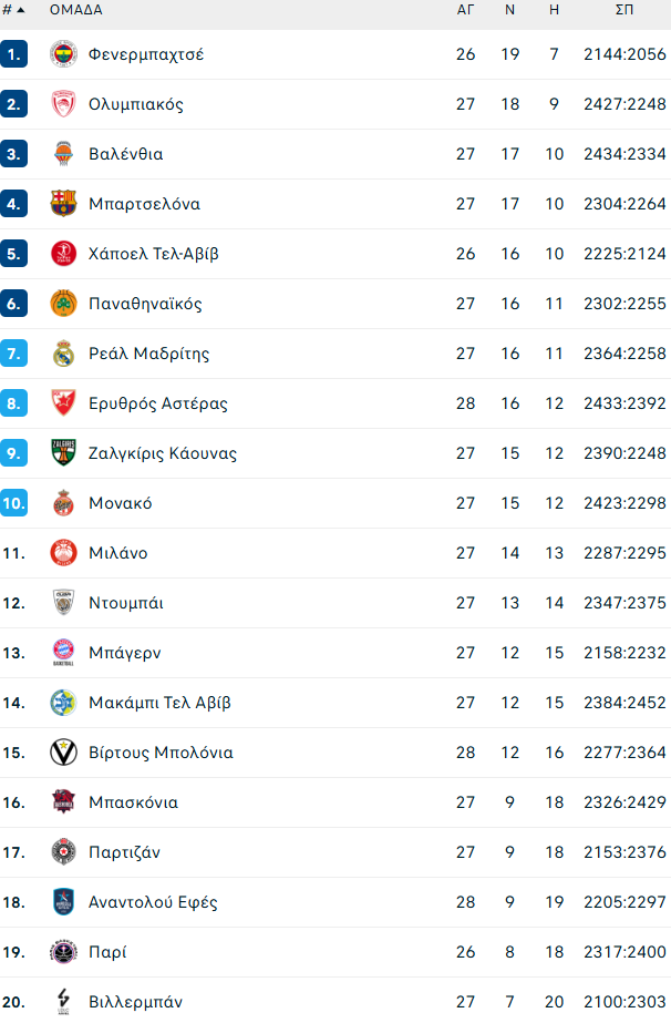 Δείτε πώς έχει διαμορφωθεί η βαθμολογία της Euroleague μετά τη νίκη του Ολυμπιακού στο ΣΕΦ