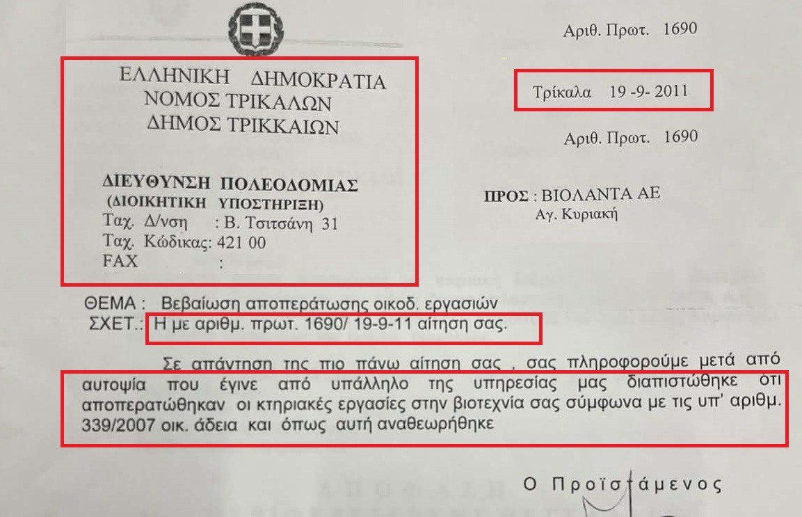 Τα ερωτήματα αυξάνονται ύστερα κι από έγγραφο του Σεπτεμβρίου 2011 που επίσης αναδεικνύει στο in σχετικά με αμφιλεγόμενη «αυτοψία» που πραγματοποίησαν οι υπάλληλοι της Διεύθυνσης Πολεοδομίας του Δήμου Τρικάλων στο ίδιο εργοστάσιο.